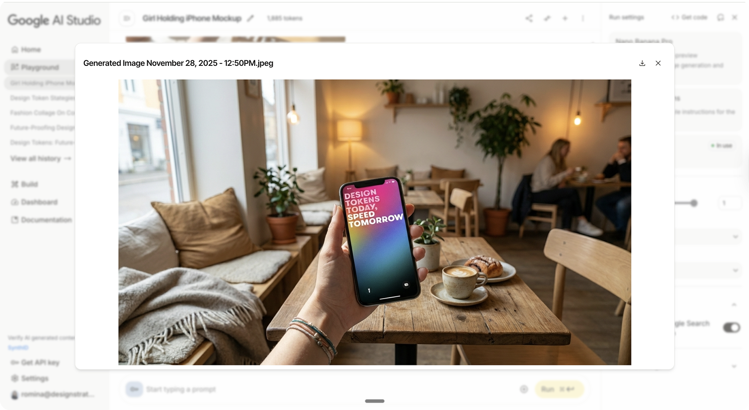 I describe what I want to build: “a design token management dashboard with sidebar navigation, search, and a table showing token values.” AI Studio generates a working a functional prototype I can click through and share.
