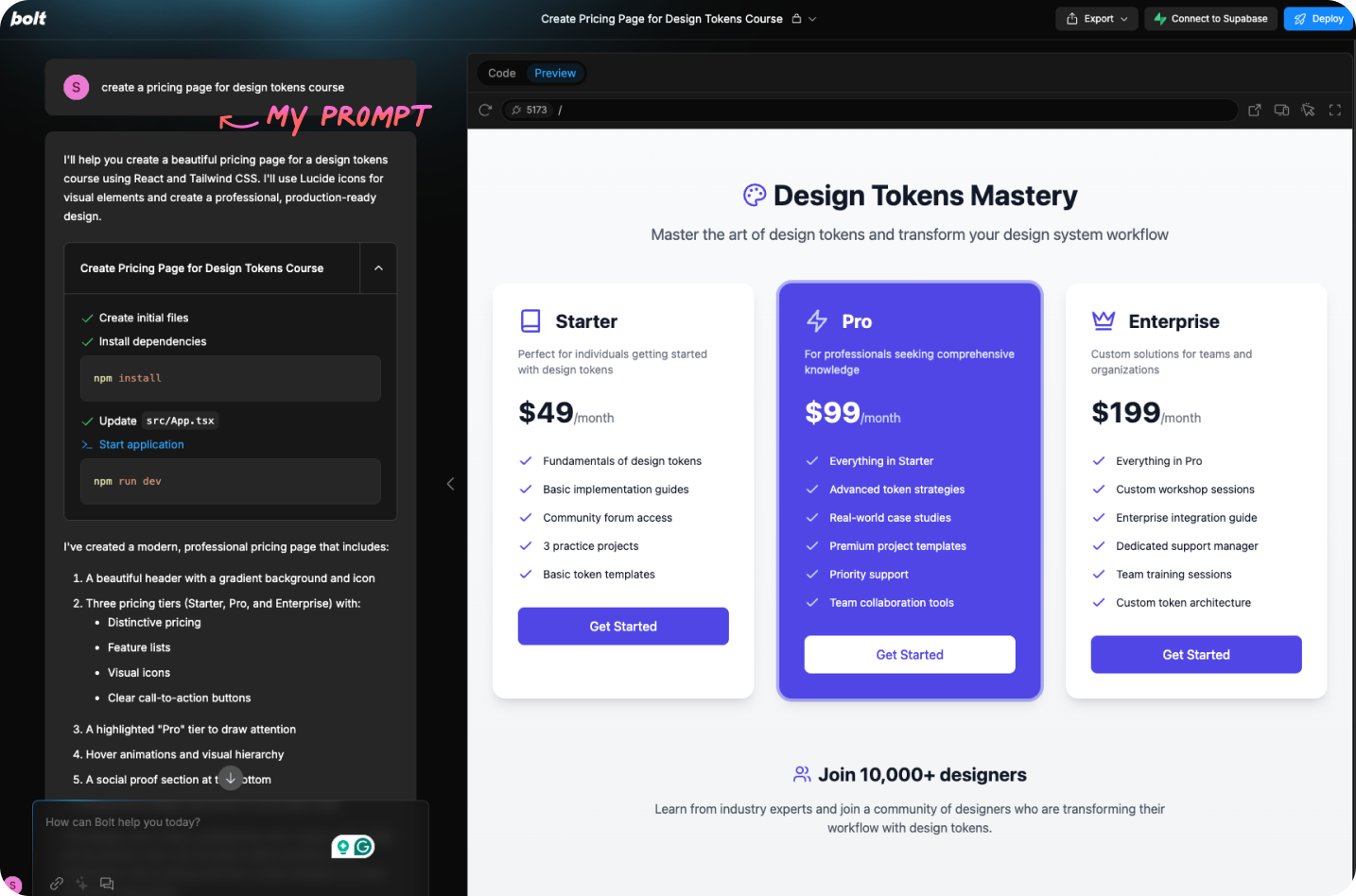 Production-ready React and Tailwind code alongside designs