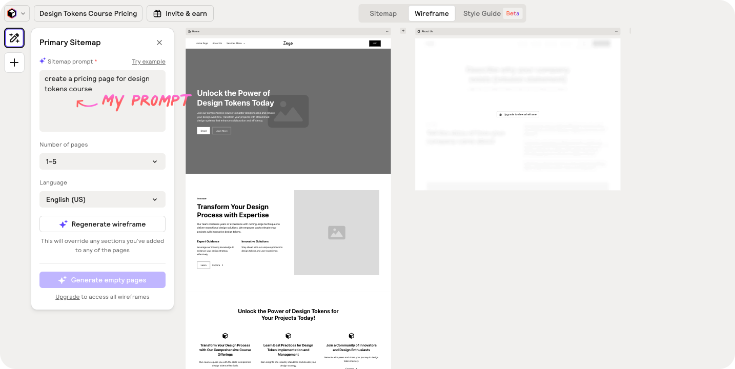 Instantly generates a sitemap and wireframes you can edit