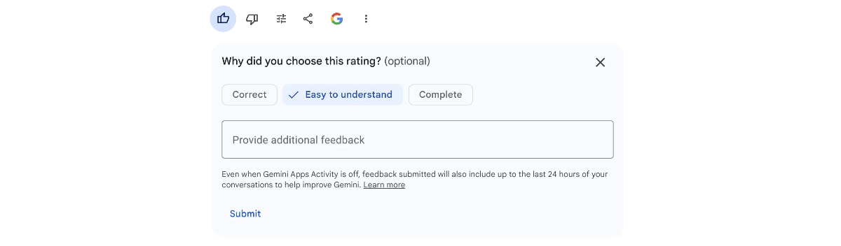 Quick actions: thumbs up/down, “this is wrong,” “improve this.”