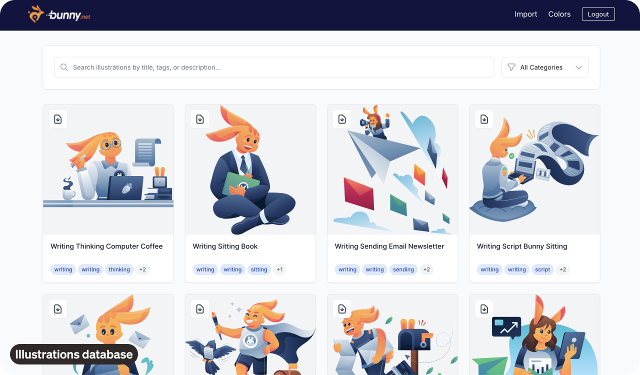 I connected bunny.net (for Storage via API), Vercel and built the database with all our .svg illustrations.