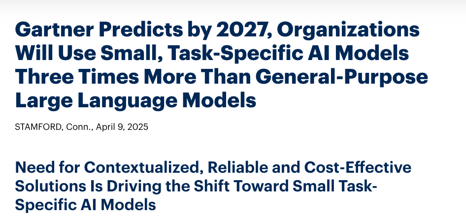 đ Gartner predicts by 2027, organizations will use small task-specific AI models three times more than general-purpose large language models - Gartner press release on the shift toward smaller, task-specific models.