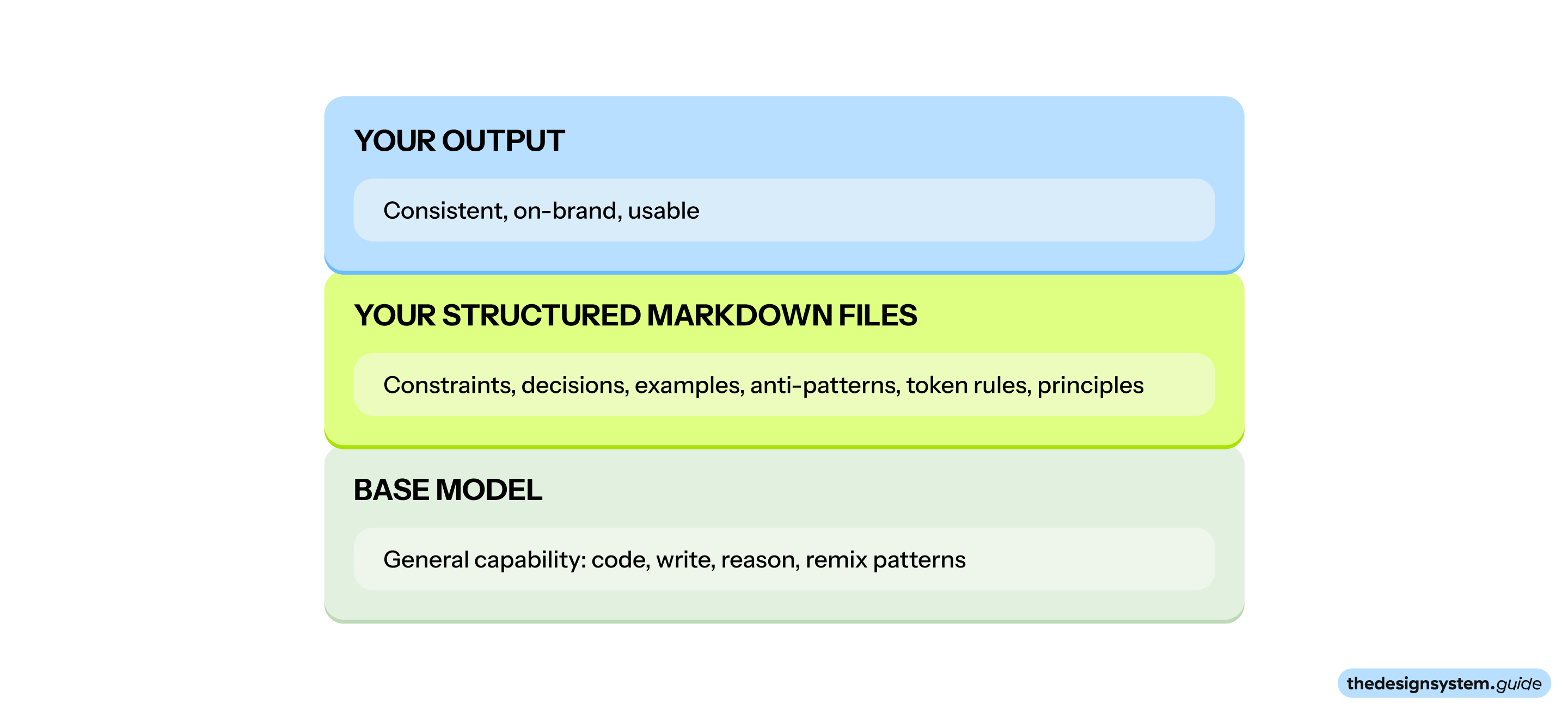 You need a âtaste layer,â or in other words, an opinionated, structured set of guidelines. The best model in the world does not know what âgood or good lookingâ means at your company. It does not know that you rejected outline buttons in 2025. It does not know that your spacing scale is 4px-based, not 8px. It does not know that color.text.muted it is for helper text, not placeholders.