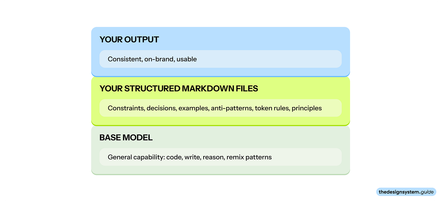 Model taste: your organizationâs judgment layer. It defines what âgoodâ means here. (Your markdown files: ds-core.md, ds-components.md, etc.)