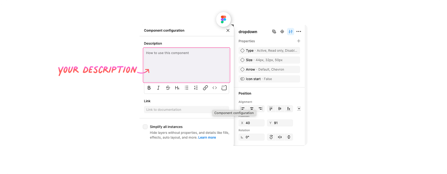 Select your component set in Figma and add a description. AI reads this and uses it for context: