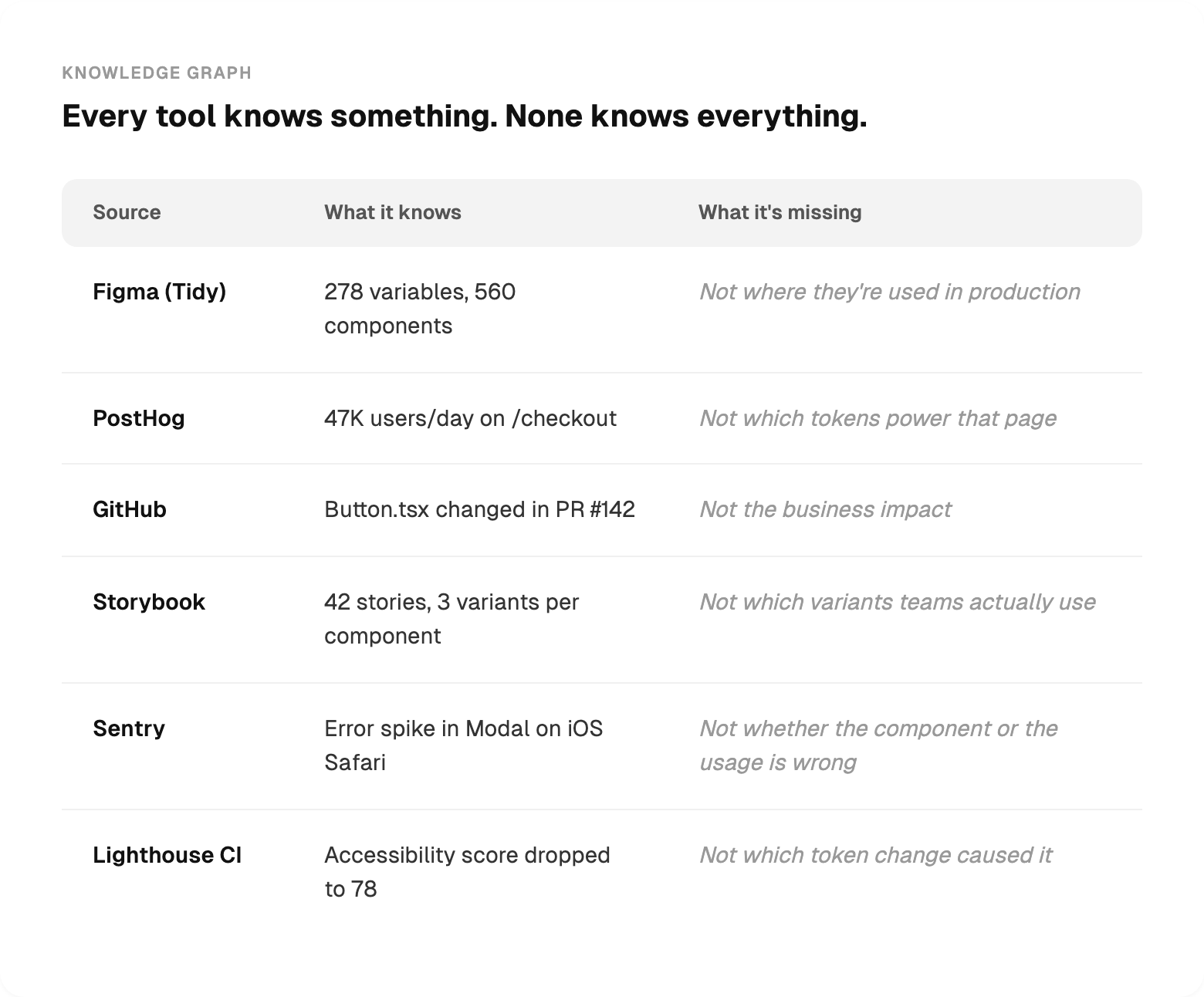 The knowledge graph connects data from tools. All queryable.
