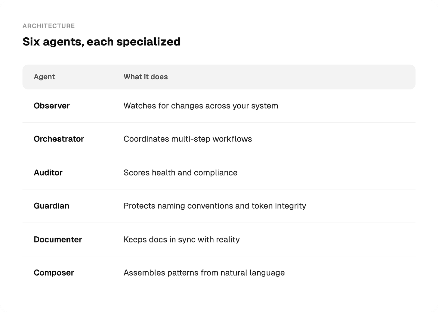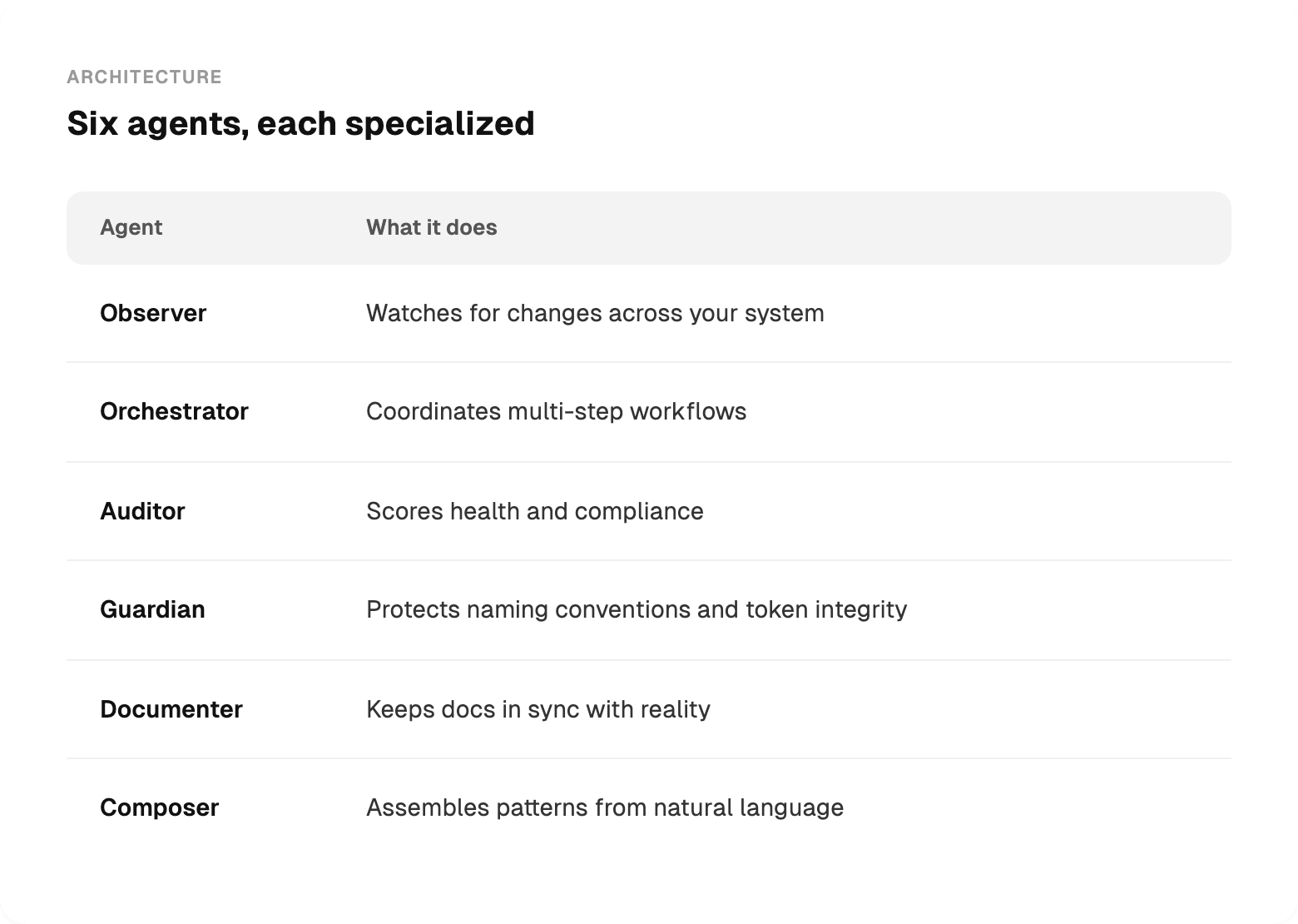 Each has clear boundaries. The Composer doesn't do health scoring. The Guardian doesn't write docs. Specialization matters because it keeps the agents focused and predictable.