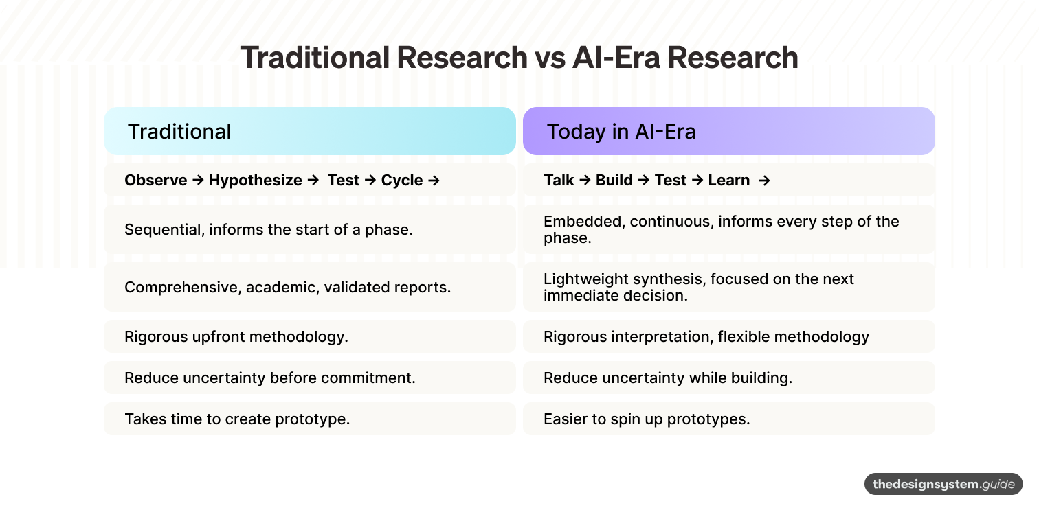 But hereâs the shift: Research isnât something you do once upfront anymore. With AI-powered speed, you can run research in continuous cycles. Talk to users, build fast, test, learn, repeat. The tools have become faster, so your learning cycles should also become faster.